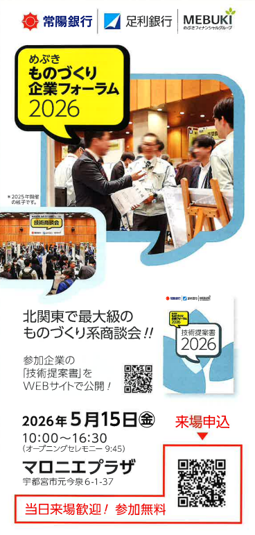 めぶきものづくり企業フォーラム2026 出展のご案内 2026.03.27 イベント 2026年5月15日に栃木県宇都宮市のマロニエプラザで開催されます 「めぶきものづくり企業フォーラム2026」に出展致します。 当社の特殊成形技術を紹介しておりますので、 ぜひお越しください。 一覧へ戻る